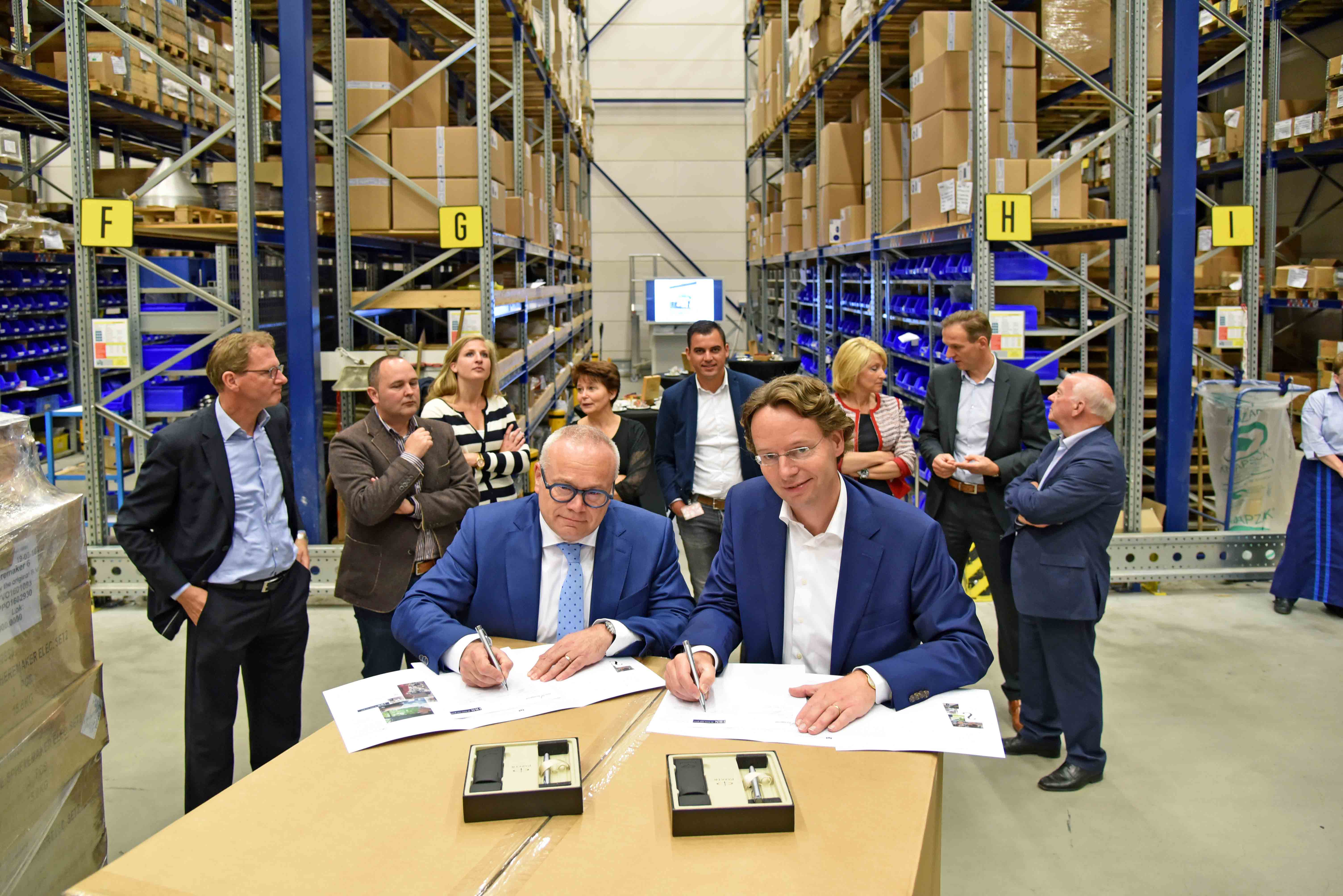 nieuwe-samenwerking-ibn-en-roc-leijgraaf-entree-werkt-logistiek Op de foto ondertekenen Maarten Gielen, algemeen directeur IBN, en Peer van Summeren, voorzitter College van Bestuur ROC De Leijgraaf, de samenwerkingsovereenkomst